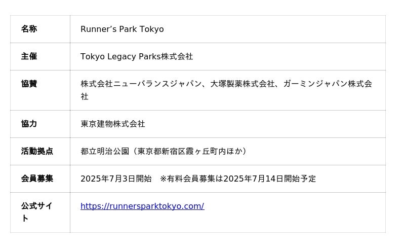 東京建物株式会社(以下「東京建物」)を代表構成団体とし、三井物産株式会社、日本工営都市空間株式会社、西武造園株式会社、株式会社読売広告社、株式会社日テレ アックスオンを構成員とするコンソーシアムが設立したTokyo Legacy Parks株式会社(以下「TLP」)は、ランニングコミュニティ「Runner’s Park Tokyo」(以下「本ランニングコミュニティ」)を設立し、新規会員募集を本日よりスタートします。