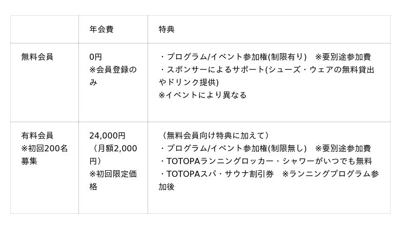 会員特典として、プログラム参加時に、ランニングシューズやウェアの無料レンタルサービスを提供します。また、今後、会員向けのスペシャルイベントも実施予定です。