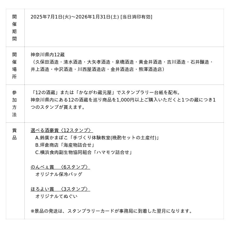 スタンプ台紙は神奈川県内にある「12の酒蔵」または「かながわ蔵元屋」で配布しています。期間中、12の酒蔵を巡り商品を1,000円以上ご購入いただくと1つの蔵につき1つのスタンプが貰えます。