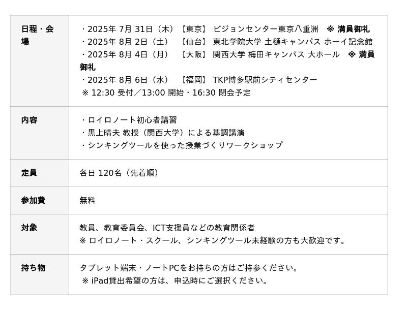 下記ページのお申し込みフォームよりお申し込みください。※ 東京・大阪会場は現在満席です。増席する場合は、公式LINEにてお知らせいたします。