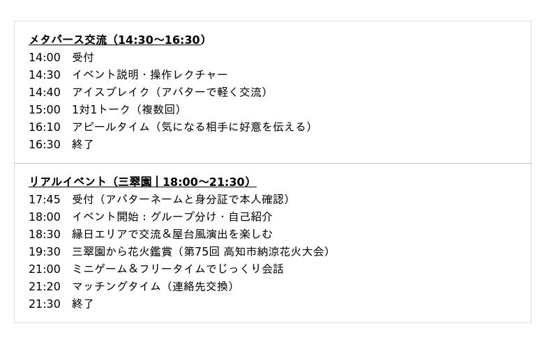 「メタバース交流」では、自身に似せたアバターを通じて1対1での会話やアイスブレイクを行い、気になるお相手と自然な形でコミュニケーションを始めることができます。そして夜の「リアルイベント」では、高知市の名門温泉旅館・三翠園の会場にて、高知市納涼花火大会の鑑賞と縁日エリアでのグループ交流を楽しむ特別プログラムをご用意。会場全体が“夏祭り”のような空気に包まれ、参加者同士の距離が一気に縮まる仕掛けとなっています。「内面をバーチャル世界で先に知り、後で実際に会える」という新しい婚活スタイルは、「いきなり対面は緊張する」「オンラインだけでは関係が深まりにくい」と不安に感じる方でも安心して参加しやすい設計となっており、段階的に仲を深めることができます。