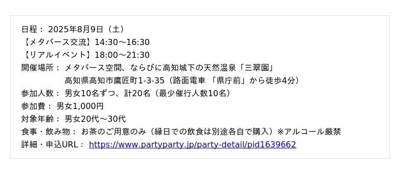 国内最多*¹の成婚数を誇る株式会社IBJ(代表取締役社長:石坂 茂、本社:東京都新宿区、東証プライム:6071)が運営する婚活パーティーサービス「IBJ Matching」は、株式会社日本旅行(代表取締役社長:吉田 圭吾、本社:東京都中央区)が受託した高知県の婚活事業に協業先として参画し、2025年8月9日(土)にメタバース空間とリアルな出会いを融合したハイブリッド婚活イベントを開催します。 本イベントでは、アバターでのオンライン交流に加え、【第75回 高知市納涼花火大会】を特別会場・三翠園から鑑賞できる婚活イベントも実施します。