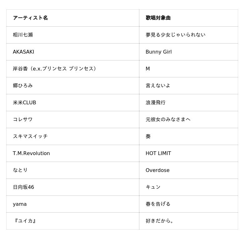 今回のコラボイベントは、ユーザーがLuckyFes出演アーティストの対象曲を歌い、採点の高得点者1名と最多投稿数者2名の計3名にLuckyFesのチケットをプレゼントするチャレンジ企画になっています。対象となるのは以下の12組のアーティストの人気曲です。