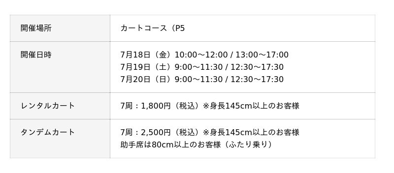 ※ 悪天候の場合、カートの走行は中止となる恐れがあります。