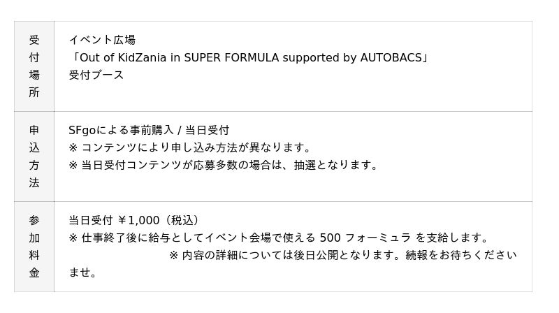 SUPER FORMULAの大人気コンテンツが今年も富士にやってくる!新コンテンツも追加されたモータースポーツの本格的な仕事体験、Out of KidZania in SUPER FORMULA supported by AUTOBACSへ参加して、私たちと一緒に働きましょう!