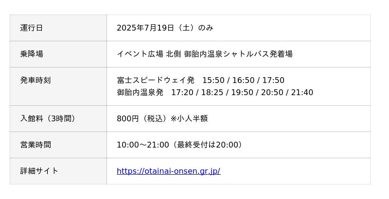 今大会は最大3日間、場内へのテント泊・車中泊ができる “スーパーフォーミュラ 夏祭り” !先月富士スピードウェイは、御殿場市と 『モータースポーツ振興・地域活性化等に係る連携協定』 を締結しました。連携協定後はじめての取り組みとして、場内にてテント泊・車中泊をされる皆さまへ、7月19日(土)に 『御胎内温泉シャトルバス』 を新たに運行します。もちろん 『あしがら温泉シャトルバス』 も運行します!