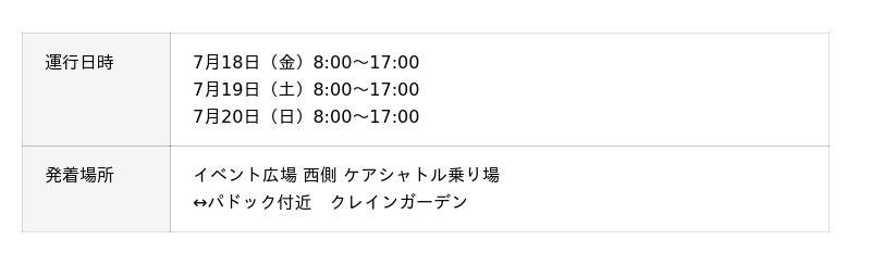 小さなお子さま連れ・ベビーカーをご利用の方、ご年輩のお客様・車いすをご利用の方向けに、イベント広場からパドック付近(レストラン クレインガーデン)を結ぶ、 『ケアシャトル&ウェルキャブ』 もご用意しております。もちろん無料で、お気軽にご利用いただけます。