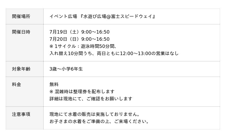 イベント開催期間中、富士スピードウェイのイベント広場に今年もミニプールが出現!小学6年生以下のお子さまは、水着とバスタオルを持って広場へお集まりください。いつもと違う場所・特別感のあるプールで、暑くて楽しい夏をスタートさせよう!