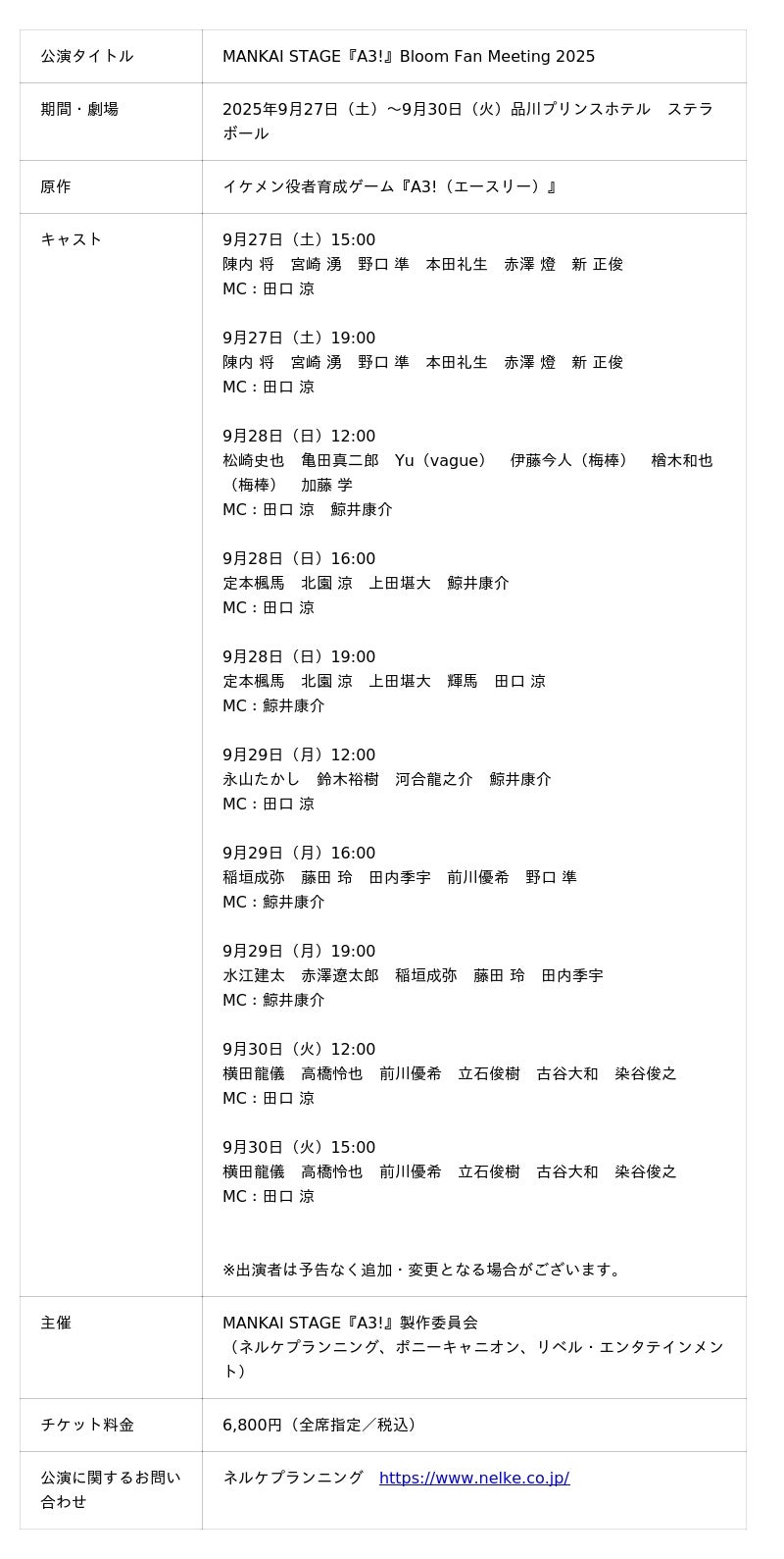 先日発表されたMANKAI STAGE『A3!』初のファンクラブ会員限定イベント、題してMANKAI STAGE『A3!』Bloom Fan Meeting 2025につきまして、イベント詳細・スケジュール・出演者を解禁いたします。