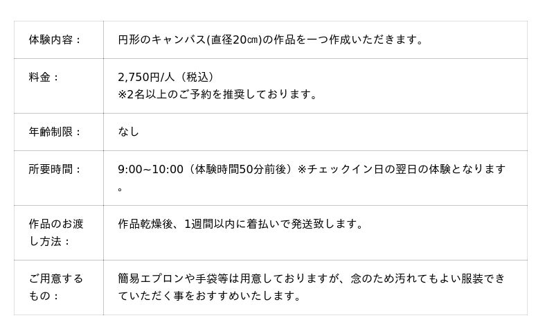 こうした土地の文化的背景と、旅先での創作体験を融合させた取り組みとして、クラフトホテル瀬戸内では、アクリル絵の具を用いて自由に色を流し込む「ポーリングアート」を採用しました。筆を使わず、偶然性も楽しみながら、世界に一つだけのアート作品を創ることができます。完成作品は、乾燥後にご自宅までお届けいたします。