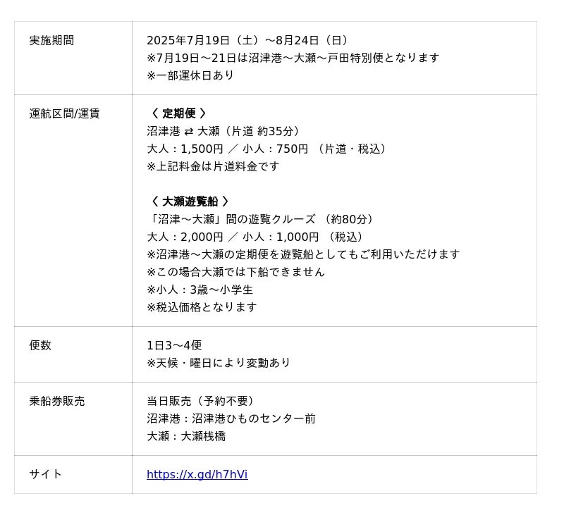 【沼津港⇄大瀬 夏季限定定期便 概要】