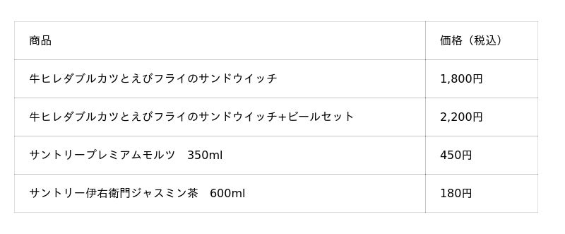 今回の大阪万博では、「あの味をもう一度」というお客様の声に応え、トレードマークである特徴的なイギリスの貴婦人のロゴと共に人気の「牛ヒレダブルカツのサンドウイッチ」と「えびフライのサンドウイッチ」のコンビメニューをご用意し期間限定で復活します。
