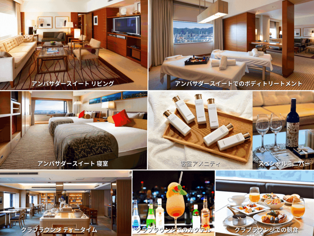 ■プランに含まれるもの:ソラフネ神戸 夜の部入場(1ドリンク付)、夕食(中国料理・鉄板焼・日本料理・鮨・カジュアルフレンチより選択)スペシャルミニバー、フィットネス&スパ「ルアナ」でのトリートメント(60分/ハワイアンロミロミまたはアロマオイルセラピーより選択)、クラブラウンジでの飲食サービスを含むエグゼクティブフロア宿泊者通常特典、13時レイトチェックアウト