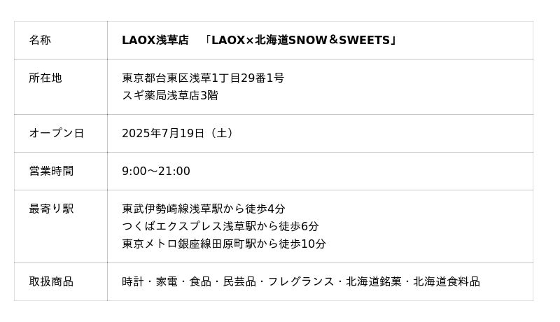 高級腕時計、家電製品、お酒や日本の銘菓などを取り扱う店舗を運営するラオックス・グローバルリテーリング株式会社(本社:東京都港区 代表取締役:西井剛)は、「スギ薬局浅草店」(2023年8月開業)の3階に、「LAOX×北海道SNOW&SWEETS」を2025年7月19日(土)にオープンいたします。