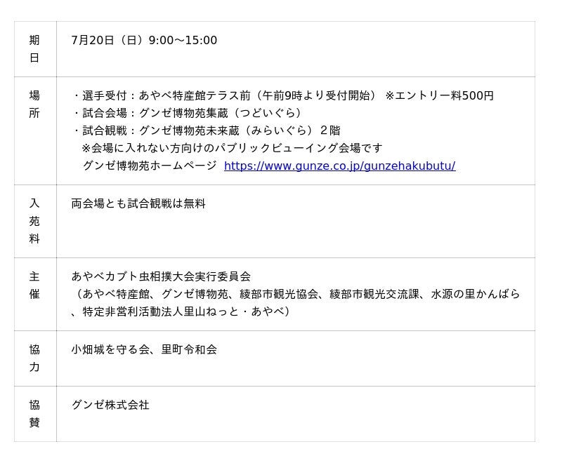グンゼ株式会社は、創業の地である京都府綾部市で行われる「第2回あやべカブト虫相撲大会」に協賛します。試合会場としてグンゼ博物苑集蔵、パブリックビューイング会場として未来蔵を提供します。