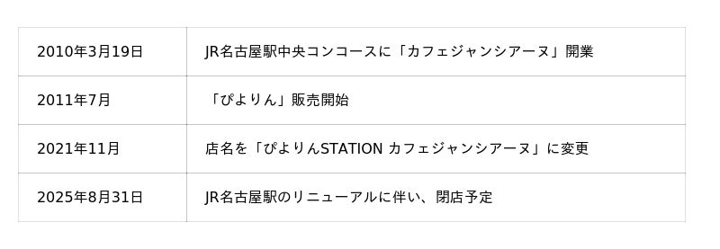 ジェイアール東海フードサービス株式会社(本社:愛知県名古屋市、代表取締役社長:岩下賢一)は、JR名古屋駅中央コンコースの「ぴよりんSTATION カフェジャンシアーヌ(以下、「ジャンシアーヌ」)」の閉店に伴い、開業から15年にわたるご愛顧への感謝を込めて、2025年8月1日(金)~2025年8月31日(日)の期間限定で「ありがとうジャンシアーヌ Premiumぴよりん」を販売します。