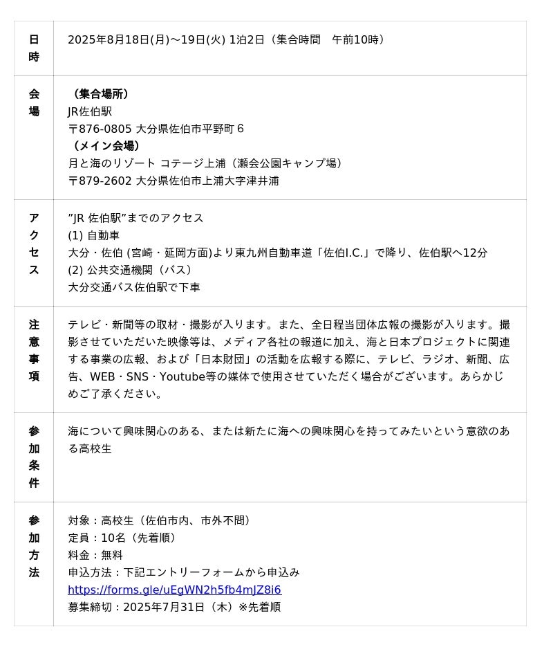 また、9月27日(土)にさいき城山桜ホールにて開催する体験発表会では、1泊2日の体験プログラムを通して感じたことや考えたこと、その後に起きた海に対する気持ちの変容などについて、参加高校生からの発表をしていただくアウトプットプログラムを予定しております。