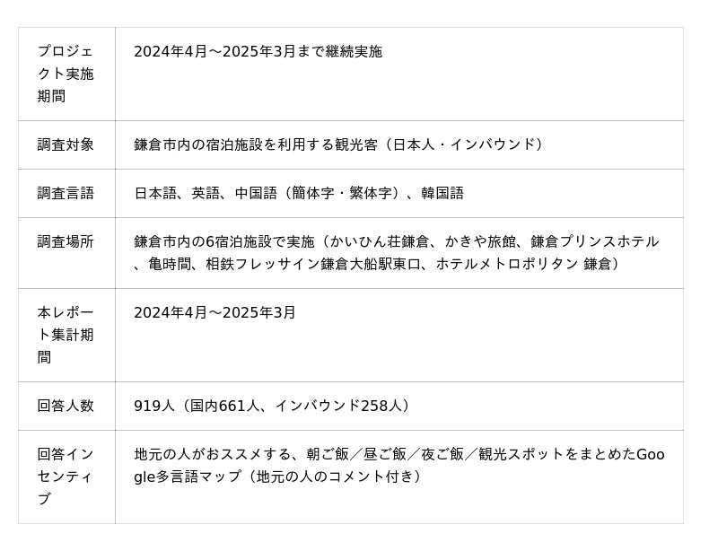 本調査は、地域活性化包括連携協定に基づく観光共創型CRM(顧客関係管理)事業の一環として実施されたものであり、「鎌倉の朝と夜の観光体験」を主なテーマとし、来訪目的や滞在中の行動傾向に関するデータを、市内宿泊施設との連携を通じて継続的に収集しております。