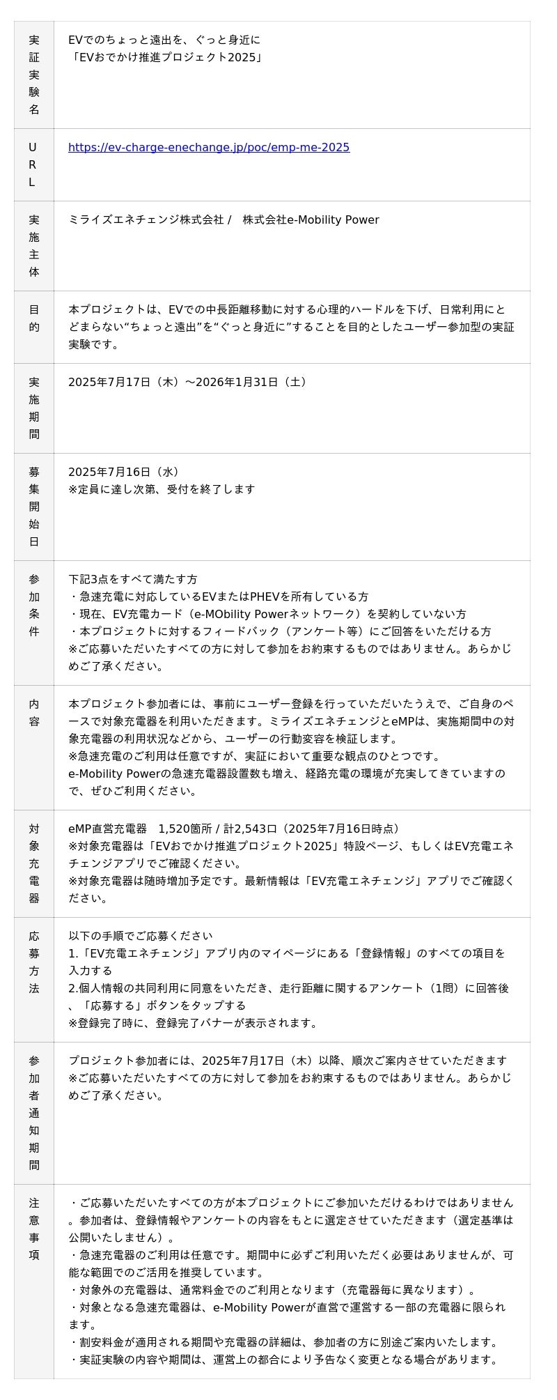 ミライズエネチェンジ株式会社(本社:東京都中央区、代表取締役社長:柘野善隆、以下「ミライズエネチェンジ」)と株式会社e-Mobility Power(本社:東京都港区、代表取締役社長:幸加木 英晃、以下「e-Mobility Power」)は共同で、EVユーザーの中長距離移動における行動変容をテーマにした実証実験「EVおでかけ推進プロジェクト2025」(以下「本プロジェクト」)を、2025年7月17日(木)より開始いたします。あわせて、本日2025年7月16日(水)より、参加者の募集を開始いたしました。