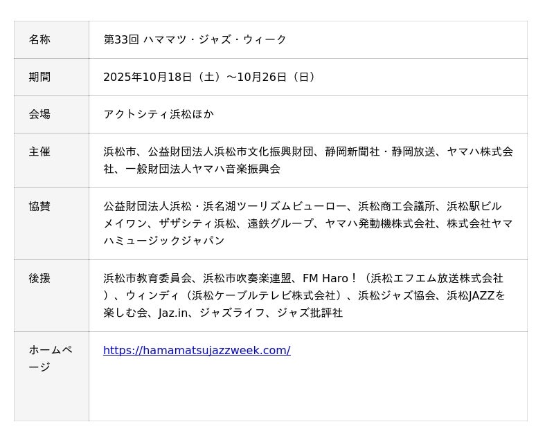 浜松市、公益財団法人浜松市文化振興財団、静岡新聞社・静岡放送、ヤマハ株式会社と一般財団法人ヤマハ音楽振興会は、日本を代表するジャズイベント「第33 回 ハママツ・ジャズ・ウィーク」を本年10月18日(土)~10月26日(日)に、アクトシティ浜松を中心とした市内各所で開催します。多彩なイベントをご用意し、9日間にわたって、浜松の街からジャズの魅力をお届けします。