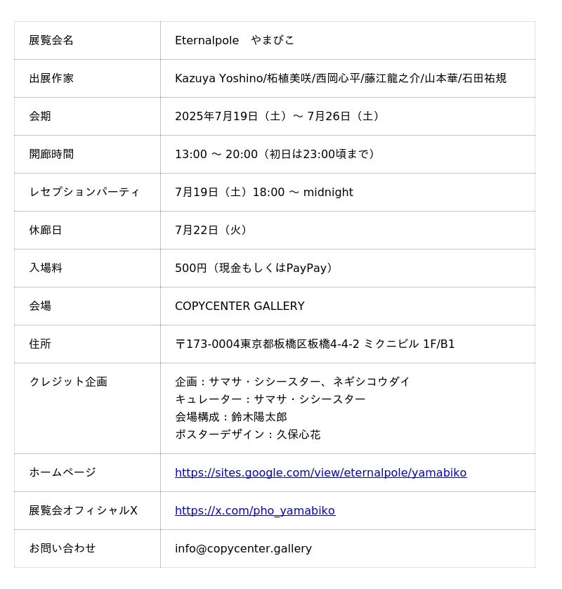 この度、アートスペースCOPYCENTER GALLERY(コピーセンターギャラリー)は、2025年7月19日(土)から7月26日(土)まで、6人の写真家 Kazuya Yoshino/柘植美咲/西岡心平/藤江龍之介/山本 華/石田祐規 による合同写真展覧会《Eternalpole やまびこ(エターナルポール やまびこ)》を開催いたします。00年代から今日まであらゆる舞台で活躍する注目のアーティストたちの最新プリントや代表作の数々を、同一の空間で心ゆくまでお楽しみいただけます。これまで殆ど接点がなかった作家同士は、企画者以外とは事前の打ち合わせさえ実施せず、それぞれが全く異なるプロセスのまま搬入の日へ挑みます。そんな挑戦的な環境をキュレーションしているのは、COPYCENTER GALLERYのスタッフであり写真家のサマサ・シシースターです。シシースターは、この展示について「思い出に残るような仕掛けがある」と度々発言しています。仕掛けとは一体何か、ぜひその場へ足をお運びいただき、お確かめください。