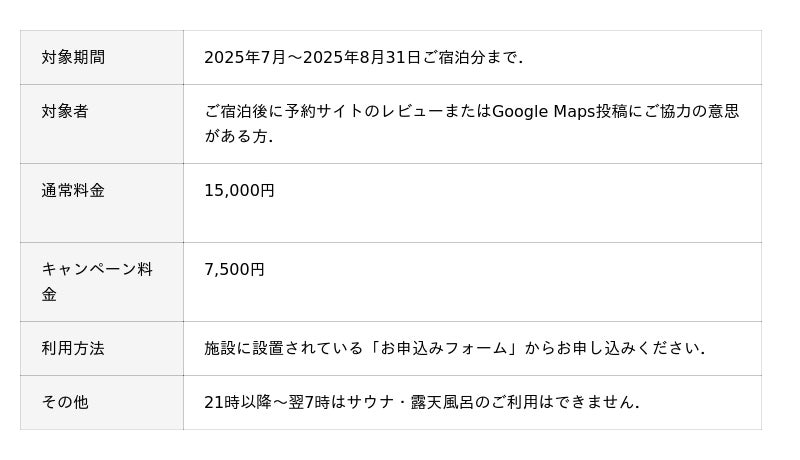 サウナオープンを記念し、2025年8月31日までにご宿泊の方向けにバレルサウナの利用料(通常15,000円)が半額(7,500円)になるキャンペーンを実施中です。この機会に夏の葉山でしか味わうことのできない海と空とともに”ととのう”時間をぜひ体験していただき、「予約サイトのレビュー」や「Google Maps」でサウナのご感想をお聞かせください。