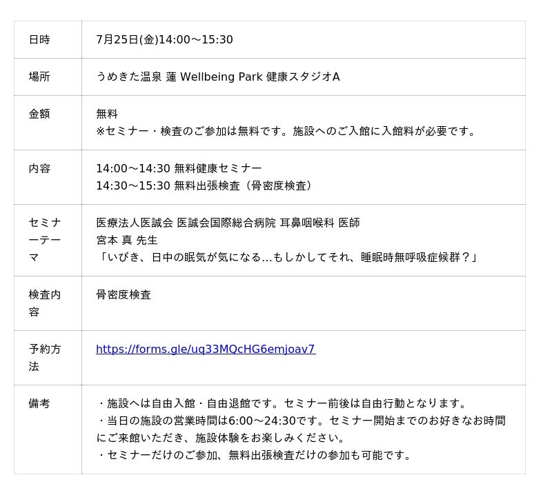 「うめきた温泉 蓮 Wellbeing Park」(総支配人:藤立 達哉、所在地:大阪市)は、2025年7月25日に、提携医療機関である医療法人医誠会(代表者:谷 幸治、本社:大阪市)の「医誠会国際総合病院」の医師を講師に招き、第3回健康セミナーを開催することをお知らせします。
