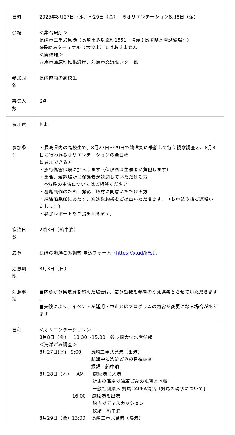 一般社団法人 海と日本プロジェクトinながさきは、2025年8月27日(水)から29日(金)まで「長崎の海洋ごみ調査2025」を実施します。2023年の大村湾内の漂流ごみ調査、2024年の河川漂流ごみ調査に続く第3弾、今回の海洋ごみ調査はマイクロプラスチックと漂着ごみが対象です。