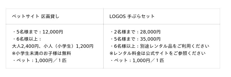 施設内には、北海道最大級のドッグランを完備しており、小型犬から大型犬までのびのびと遊ぶことができます。総面積110万m2(東京ドーム約24個分)の広さを誇るため、愛犬とともに思い切りキャンプをお楽しみいただけます。さらに、手ぶらでキャンプを楽しめるサービスも充実しており、LOGOSの最新キャンプギアを自由に利用できるほか、設営や撤収はすべてスタッフが対応するため、初心者の方やご家族連れでも安心してご利用いただけます。