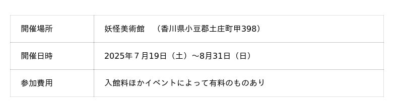 香川県・小豆島の「迷路のまち」(土庄本町)の妖怪美術館(小豆島ヘルシーランド株式会社)は、「妖怪きもだめしまつり2025」を、2025年7月19日(土)~8月31日(日)開催します。期間中は夜9時まで営業し17時以降に入館のかたに様々な特典が楽しめます。またお盆休みの8月13日~15日には「妖怪縁日」を開催、美術館の受付前で妖怪にちなんだ屋台を楽しめます。