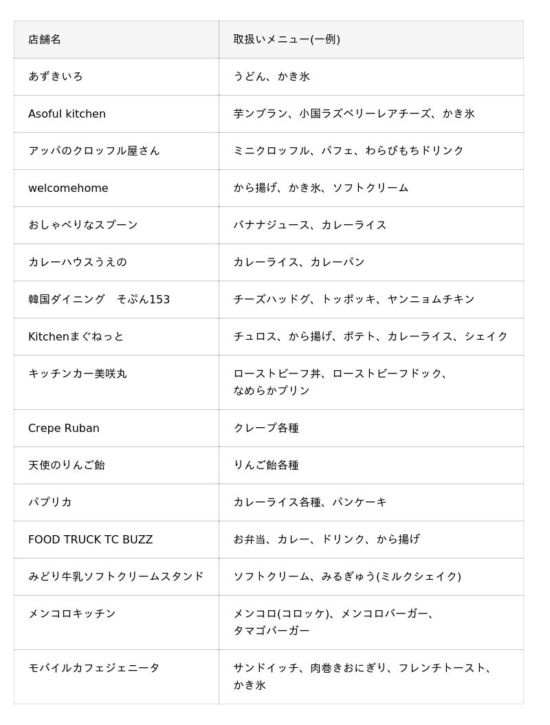 ※上記店舗一覧は予定となります、一覧にない店舗の出店や、やむを得ない事情により休業となる場合もございます。
