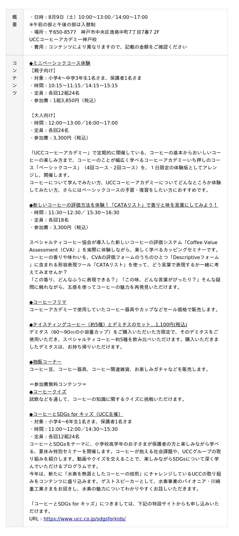 今回のイベントでは、UCCコーヒーアカデミーいちおしのセミナーであるコーヒーの基本を楽しく学べるベーシックコースの体験版「ミニベーシックコース」(親子向け・大人向けの2種からお選びいただけます)、スペシャルティコーヒー協会※が導入した新しいコーヒーの評価システムを体験いただけるカッピングセミナー、コーヒーフリマなど、コーヒー好きの方にお楽しみいただけるコンテンツを多数ご用意しています。