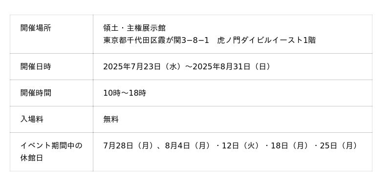 詳細は公式サイト(イベント情報|領土・主権展示館)でご覧いただけます。