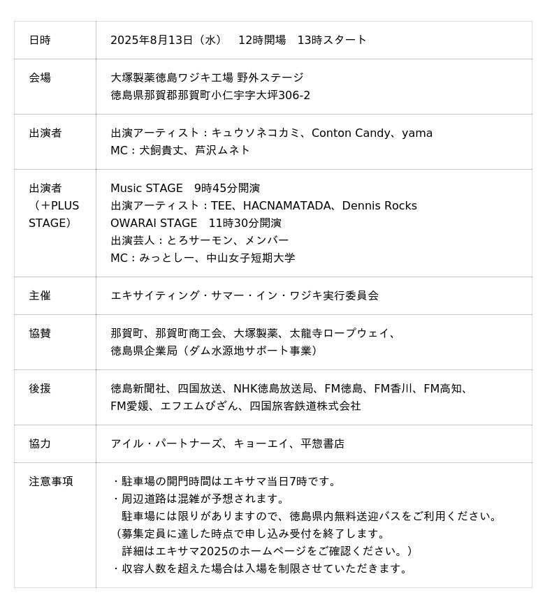 大塚製薬株式会社(本社:東京都、代表取締役社長:井上 眞、以下「大塚製薬」)は、大塚グループ発祥の地である徳島県への貢献を目指し、地元自治体などとの共催で、8月13日に徳島ワジキ工場(徳島県那賀郡那賀町)で入場無料の野外ライブ「EXCITING SUMMER in WAJIKI 2025」(以下「エキサマ」)を開催します。