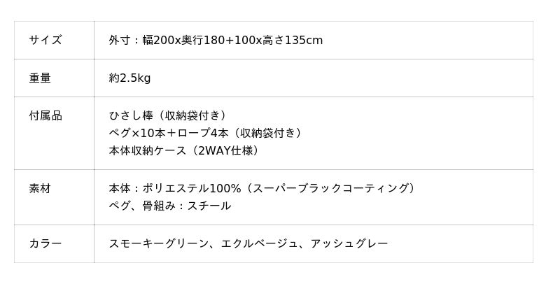 前述の通り、本製品はスーパーブラックコーティングを施しており、強い日差しや紫外線が気になるシーンでも安心してお使いいただけます。さらに、高い遮熱効果によりテント内の暑さを和らげ、真夏のレジャーやキャンプでも心地よく過ごせる快適性を追求した仕様となっています。