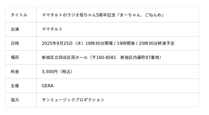 「ママタルトのラジオ母ちゃん」は2020年から配信を開始し、今年で5周年を迎えます。そんな5周年に、リスナーへの感謝を込めて、特別企画とトークがたっぷりのイベントを開催いたします。