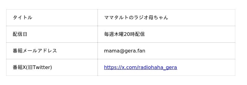 プロシューマー支援事業を展開する株式会社ファンコミュニケーションズ(本社:東京都渋谷区、代表取締役社長:二宮幸司 東京証券取引所プライム市場:2461)が運営する国内最大級のお笑いラジオアプリ「GERA(ゲラ)」は、現在配信中の「ママタルトのラジオ母ちゃん」の番組イベントを9月25日(木)19時に開催いたします。