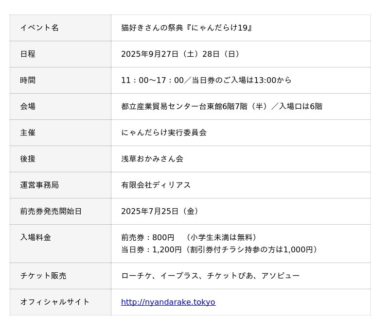 『にゃんだらけ19』は、当日券1,200円のところ、おトクな前売券(800円)が7月25日(金)から発売開始。猫を飼っている方も飼っていない方も、猫ちゃんが大好きな皆さんのご来場をお待ちしてます!