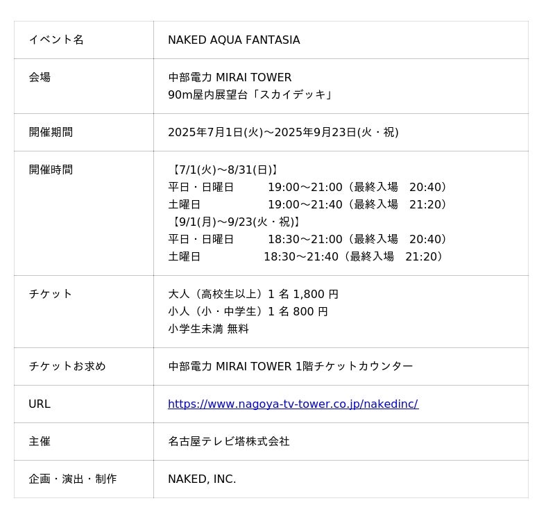 中部電力 MIRAI TOWER(所在地:愛知県名古屋市、運営:名古屋テレビ塔株式会社)では、2022年夏より、株式会社ネイキッド(英語表記:NAKED, INC. 、所在地:東京都渋谷区、代表:村松亮太郎)とのコラボレーションを開始し、プロジェクションマッピングによる夜景体験を季節に応じてお届けしてきました。2025年夏は”海の世界”をテーマに、『NAKED AQUA FANTASIA』を好評開催中です。8月からは、お子様限定のぬりえイベントや、熱中症予防の取り組みもスタートします。夏のおでかけに、中部電力 MIRAI TOWER にぜひお越しください。