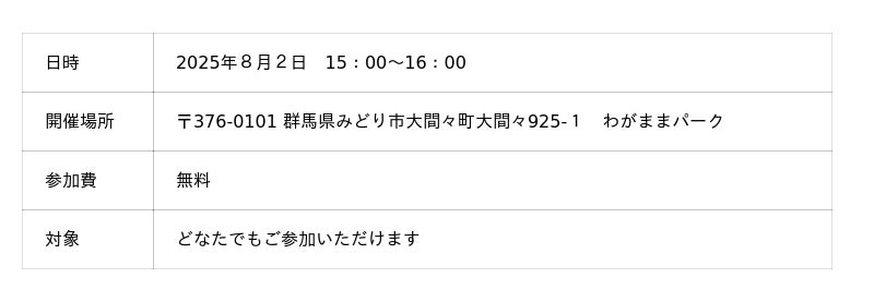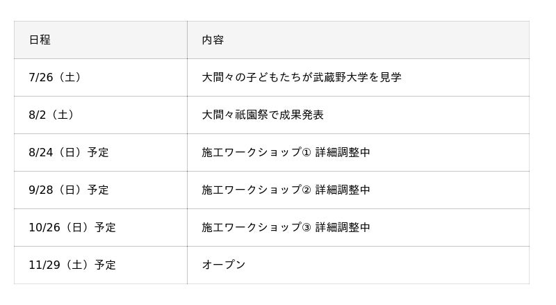 8月2日(土)には「大間々祇園祭」の会場にて、これまでの取り組み成果を発表予定です。その後、8月~10月にかけて施工ワークショップを実施し、地域住民とともに実際の公園づくりを進めていきます。グランドオープンは2025年11月末を予定しています。