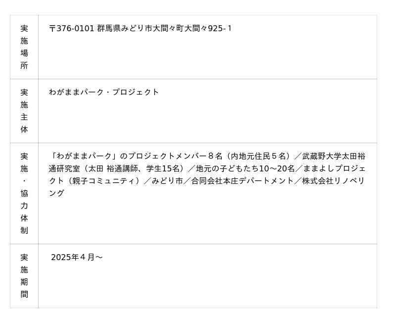 武蔵野大学工学部建築デザイン学科(東京都西東京市、学長:小西 聖子)の太田 裕通講師と学生15名(大学院生5名、学部4年生10名)は、2022年に過疎地域※に指定された群馬県みどり市大間々町にて遊休不動産を活用した「私設公園」づくりに取り組む「わがままパーク・プロジェクト」に2025年4月から参画しました。