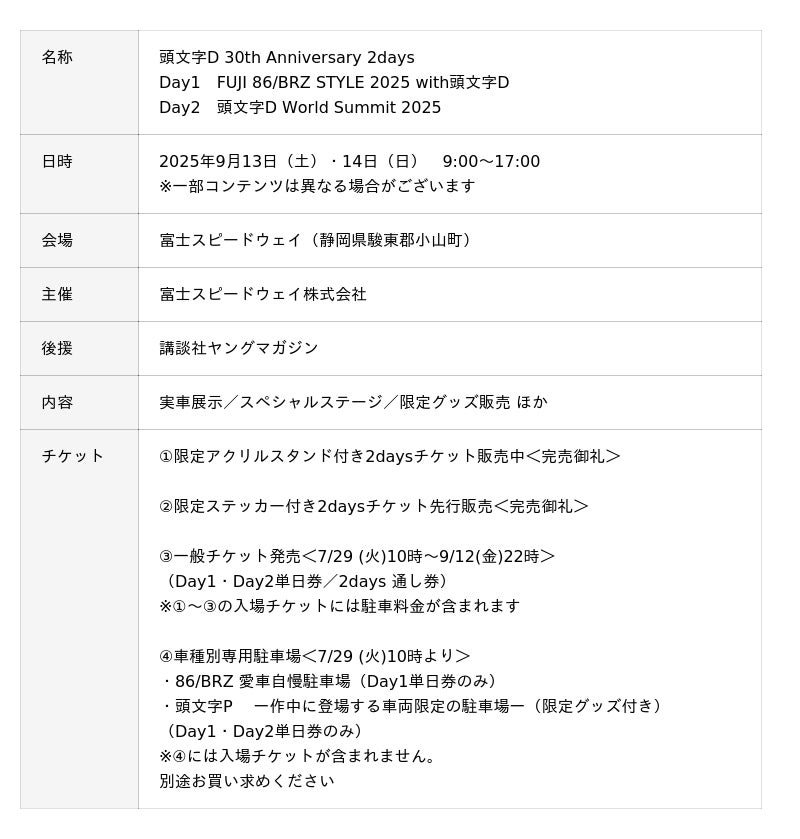 富士スピードウェイ株式会社(本社:静岡県駿東郡小山町)は、講談社ヤングマガジンの後援のもと、伝説的大ヒット漫画『頭文字D』(著:しげの秀一)の連載開始30周年を記念したスペシャルイベント「頭文字D 30th Anniversary 2days」を、2025年9月13日(土)・14日(日)の2日間にわたり開催いたします。
