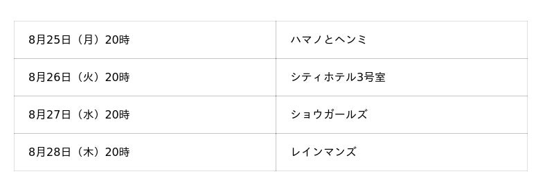 初回配信日以降、各組は同曜日・同時刻で4週連続配信いたします。