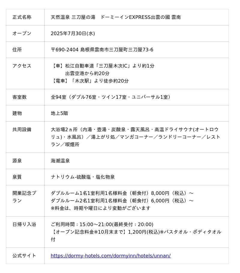 『ドーミーインEXPRESS出雲の國 雲南』公式サイト:https://dormy-hotels.com/dormyinn/hotels/unnan/