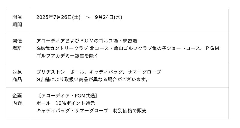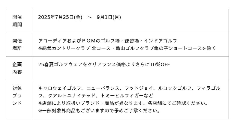2025年1月31日にアコーディアが株式会社平和にグループ入りし、世界最大のゴルフ場保有会社が誕生したことを記念して、アコーディアとPGMの両社が合同で開催するプロショップキャンペーンです。今回の『プロショップ感謝祭』では、2025年7月25日(金)~9月1日(月)までの期間中、今年の春夏モデルのアパレル対象商品がクリアランス価格から10%OFFとなり、大変お買い得です。さらに、『ブリヂストン夏祭り』、『ECCOシューズキャンペーン』も同時開催。