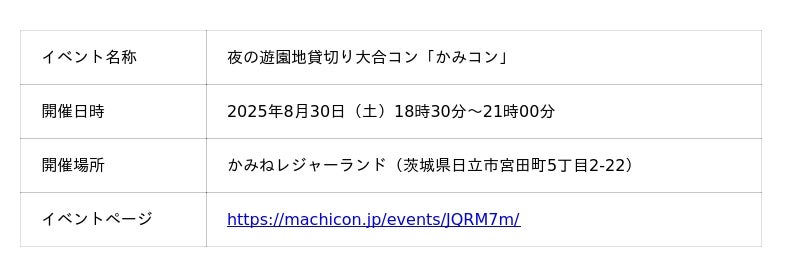 株式会社リンクバル(本社:東京都中央区、代表取締役社長:吉弘和正、証券コード:6046、以下「リンクバル」)が運営するイベントECサイト「machicon JAPAN」は、2025年8月30日に茨城県の「かみねレジャーランド」にて開催される【夜の遊園地貸切り大合コン(かみコン)、以下「本イベント」】の掲載を開始いたしました。