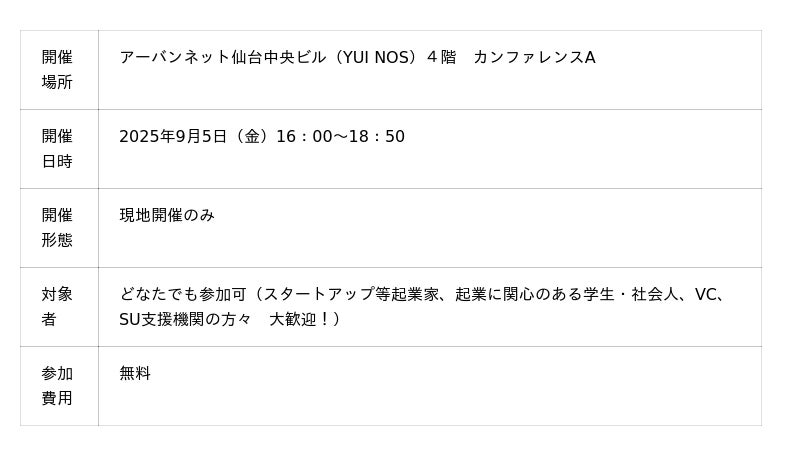 人口減少、高齢化などの地域における社会課題が深刻化する中、データやデジタル技術を用いて、スピード感を持って課題解決に取り組む起業家たちのチカラが地域にとって必要不可欠です。同時に、その課題解決のソリューションやサービスは、地域や国境の壁まで超えて、世界の課題解決モデルになる可能性も秘めており、宮城・東北からいきなり世界を目指す、そんなマインドセットやアクションも重要になります。