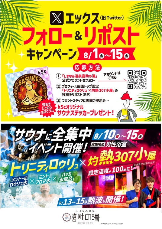 しまなみ温泉 喜助の湯(所在地:愛媛県今治市)は、2025年8月10日(日)~15日(金)の6日間にわたり、夏季限定サウナイベント「サウナに全集中!」を開催いたします。また、8月1日(木)より、公式X(旧Twitter)アカウントを活用したフォロー&リポストキャンペーンも実施。期間中、体もSNSも“ととのう”スペシャル企画が盛りだくさんです。