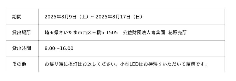 『提灯』と同じく、花販売所でお貸し出しをしておりますので、お気軽にお声掛けください。