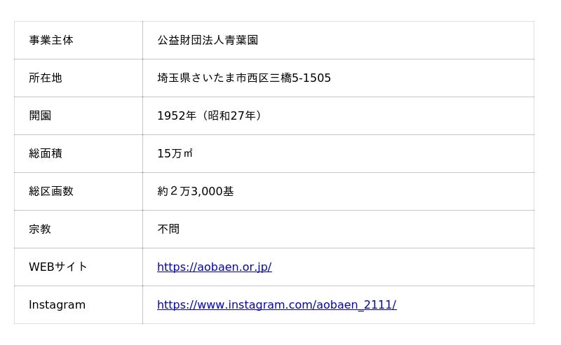 青葉園は、昭和27年に開園した日本初の民営公園墓地です。昭和32年に「財団法人」の認可を受け、平成27年に「公益財団法人」に移行。埼玉県内で、公益財団法人が運営する2つの霊園のうちの1つです。